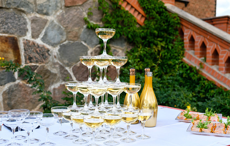 A champagne tower set against heritage stone — where tradition, celebration and effortless service meet.